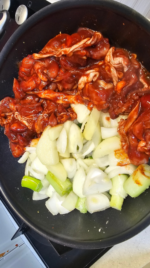 - 닭고기를 팬 바닥에 깔고, 그 위에 볶은 야채를 덮듯이 올려요.