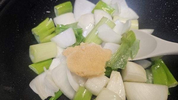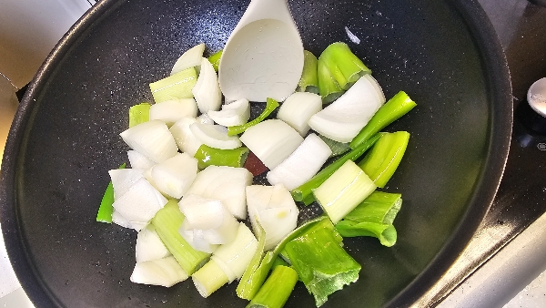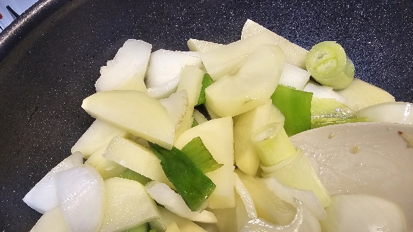 - 강불에서 대파를 먼저 볶고, 향이 올라오면 양배추, 고구마 순서로 넣어 볶아요.