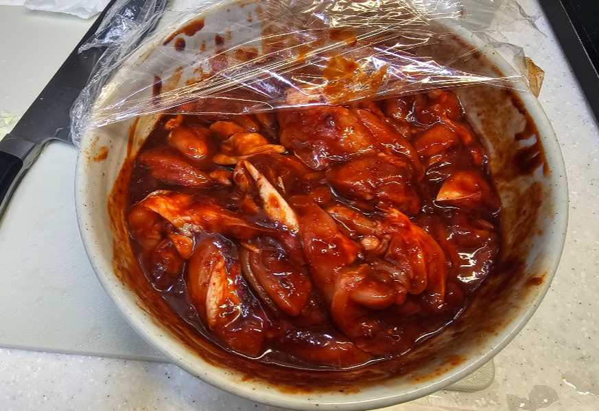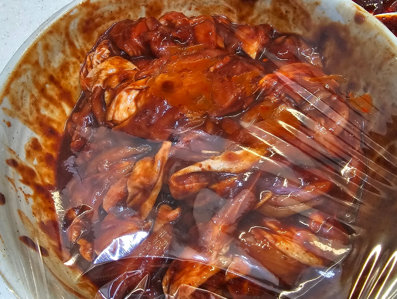 양념된 고기는 랩에 씌워 냉장고로 보내줍니다.
